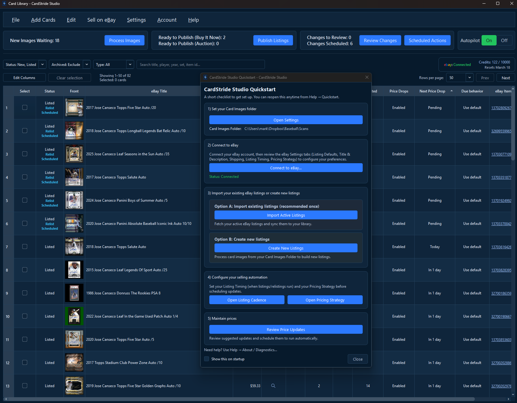 Import your active listings and set up automated price drops for Buy It Now listings immediately. CardStride is a game-changer even if you only use it for pricing updates and relisting. You can keep your current listing-creation workflow.